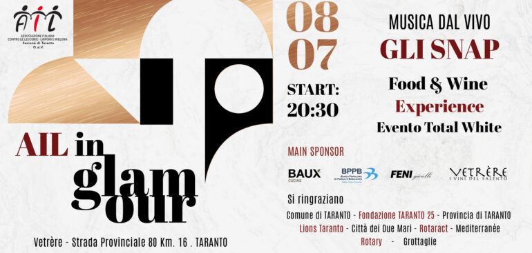 AIL in GLAMOUR – Azienda Agricola Vetrere – 8 Luglio 2023 – Ore 20:30 è un’opportunità straordinaria per unire informazione, cultura e consapevolezza del territorio tarantino